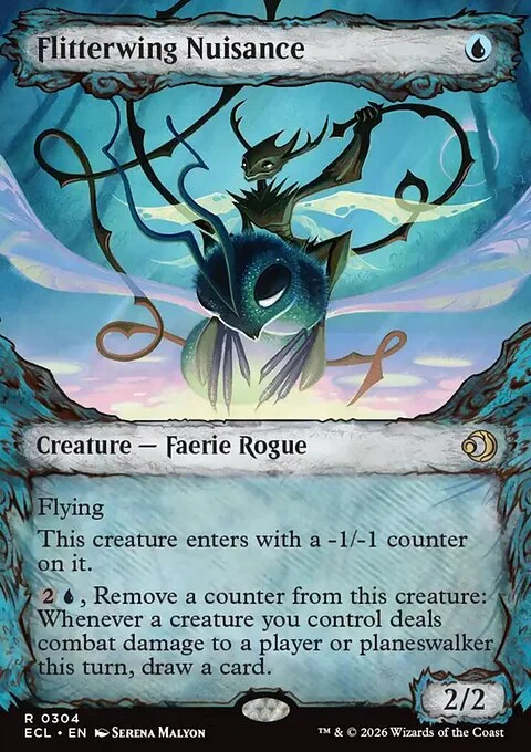 Flying This creature enters with a -1/-1 counter on it. {2}{U}, Remove a counter from this creature: Whenever a creature you control deals combat damage to a player or planeswalker this turn, draw a card.