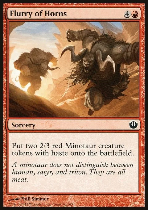 Create two 2/3 red Minotaur creature tokens with haste.