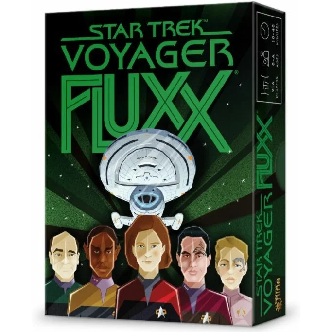 Journey home from the Delta Quadrant aboard the Starship Voyager! In Star Trek: Voyager Fluxx, the fourth Fluxx excursion into the Star Trek universe, Captain Janeway and her crew will encounter familiar enemies: The Kazon, Species 8472, and of course, the Borg. The classic ever-changing rules of Fluxx are further enhanced by twists like the Caretaker and Ancestors' Eve. Janeway from the future might even show up in a Timeship!