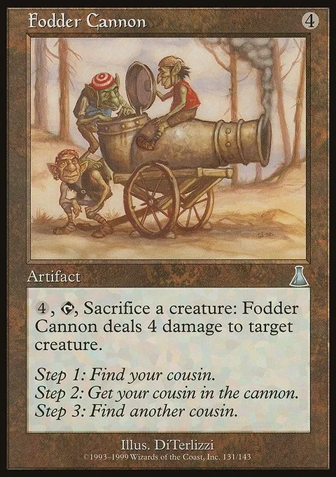 4, tap, Sacrifice a creature: Fodder Cannon deals 4 damage to target creature.