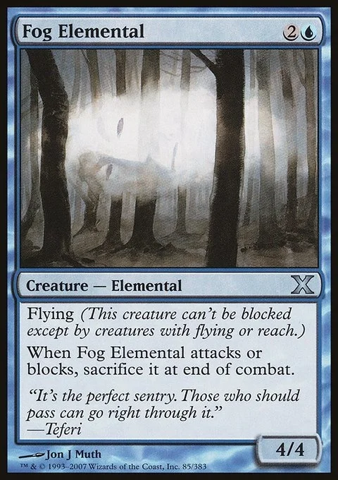 Flying (This creature can't be blocked except by creatures with flying or reach.) When Fog Elemental attacks or blocks, sacrifice it at end of combat.