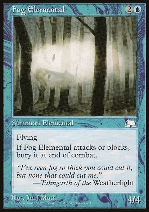 Flying (This creature can't be blocked except by creatures with flying or reach.) When Fog Elemental attacks or blocks, sacrifice it at end of combat.