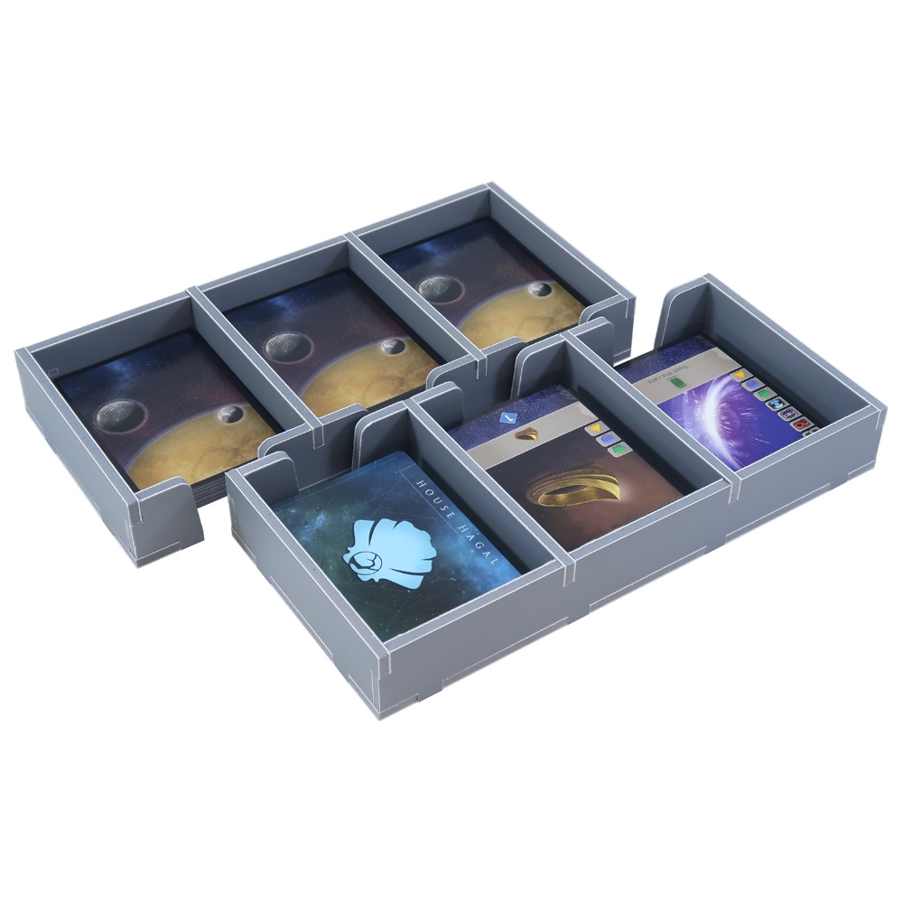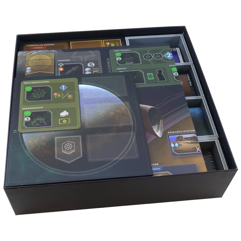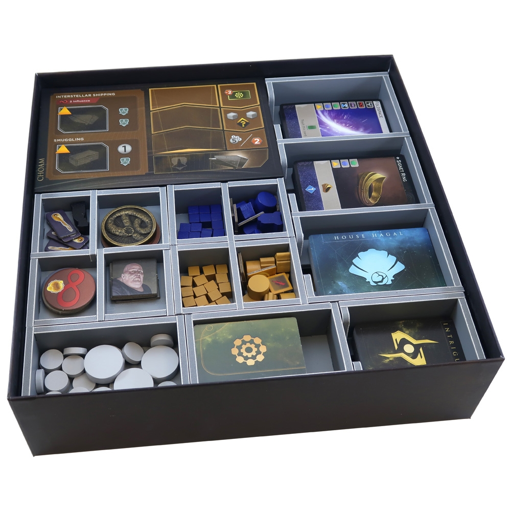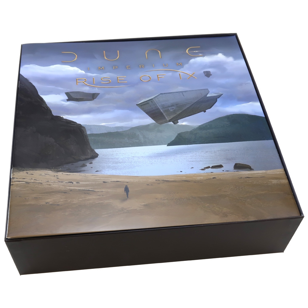 Insert compatible with Dune Imperium®, including the Dune: Imperium – Rise of Ix® expansion and the Deluxe Upgrade Pack® contents. The design provides both efficient storage and improved game play.