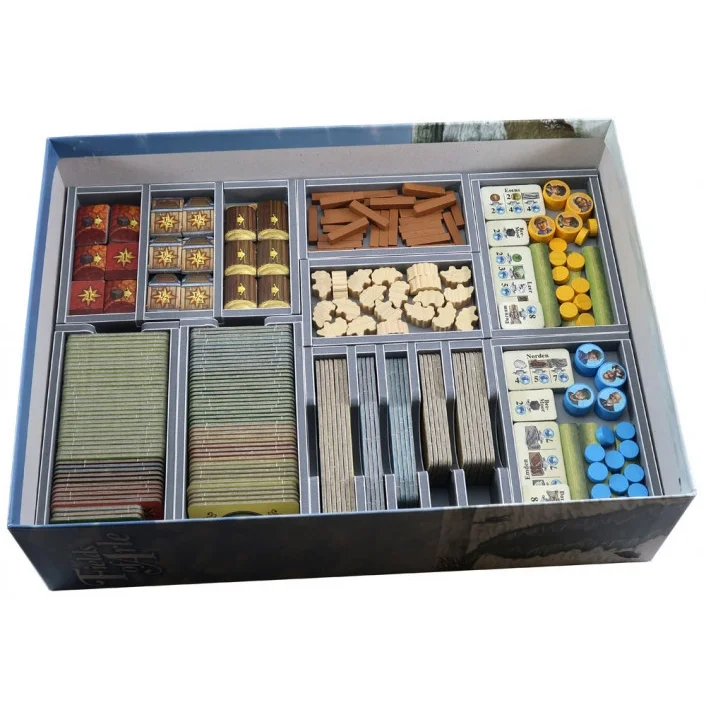 Insert compatible with Fields of Arle® and the Tea & Trade® expansion. The design provides both efficient storage and improved game play. Many of the trays can be utilised during the game, and they greatly aid set-up and clear-away times. The rule books and boards act as a lid on top of the trays.
