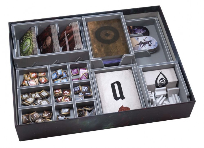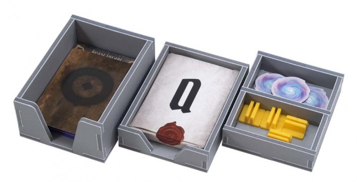 Insert compatible with Gloomhaven: Forgotten Circles® expansion. The design provides both efficient storage and improved game play. Many of the trays can be utilised during the game, and they greatly aid set-up and clear-away times. The rule book and sticker sheet act as a lid on top of the trays.