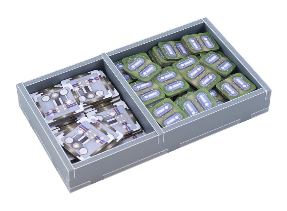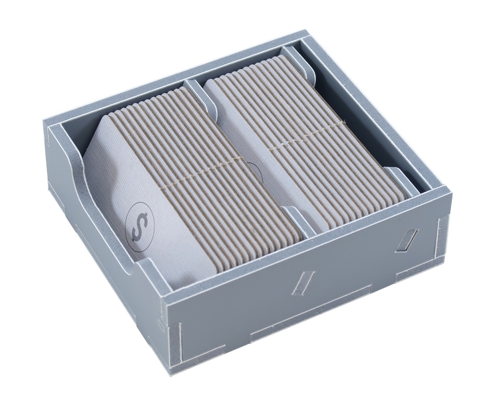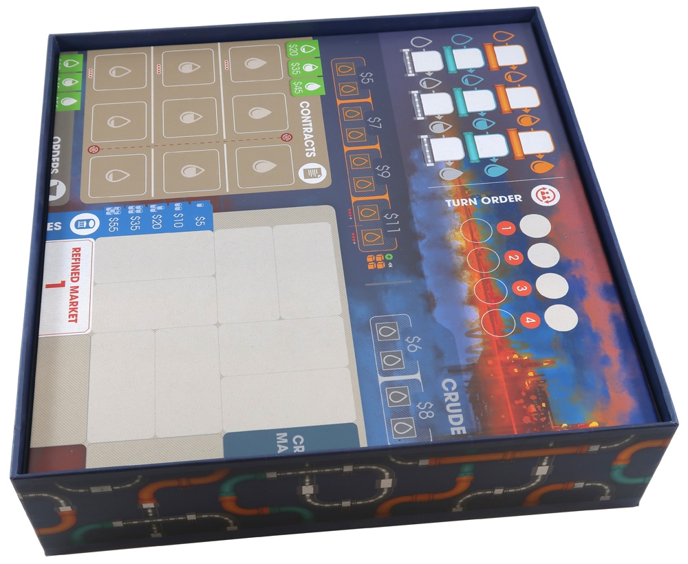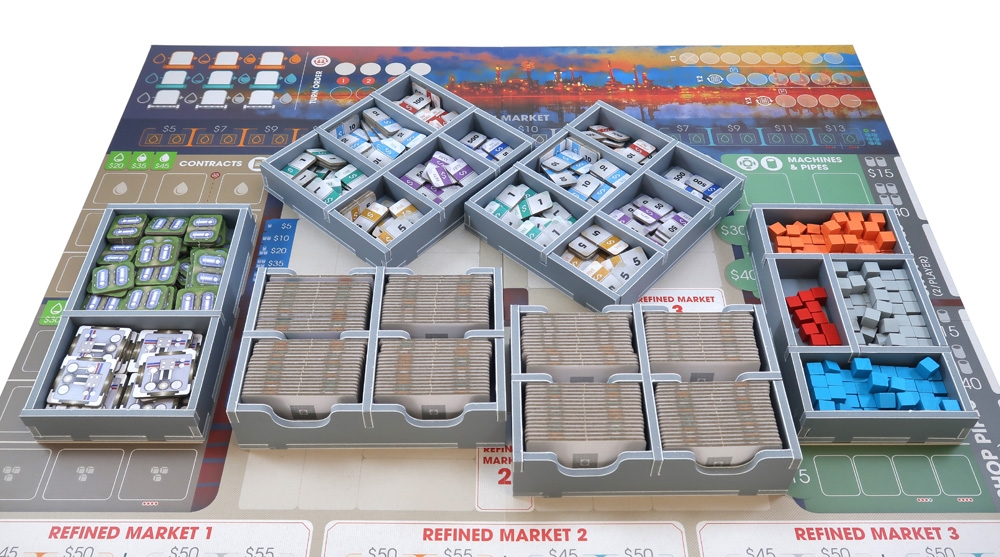 Insert compatible with Pipeline®, and includes space for the Emerging Markets® expansion. The design provides both efficient storage and improved game play. Many of the trays can be utilised during the game, and they greatly aid set-up and clear-away times. The boards and player boards act as a lid on top of the trays.