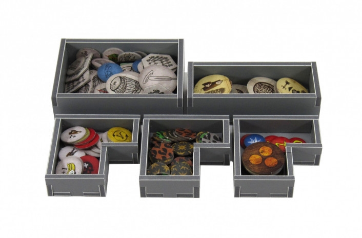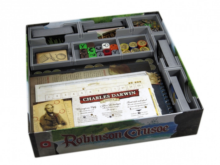 This Campaign 3 insert is designed to be compatible with Robinson Crusoe® and the Voyage of the Beagle Vol. 1 ® expansion. The design provides both efficient storage and improved game play. The trays can be utilised during the game, and they greatly aid set-up and clear-away times. The rules and boards act as a lid on top of the trays. The insert is arranged in two layers as shown. Note that the island hexagon tiles and first player token are stored in between the other trays at the bottom of the image.