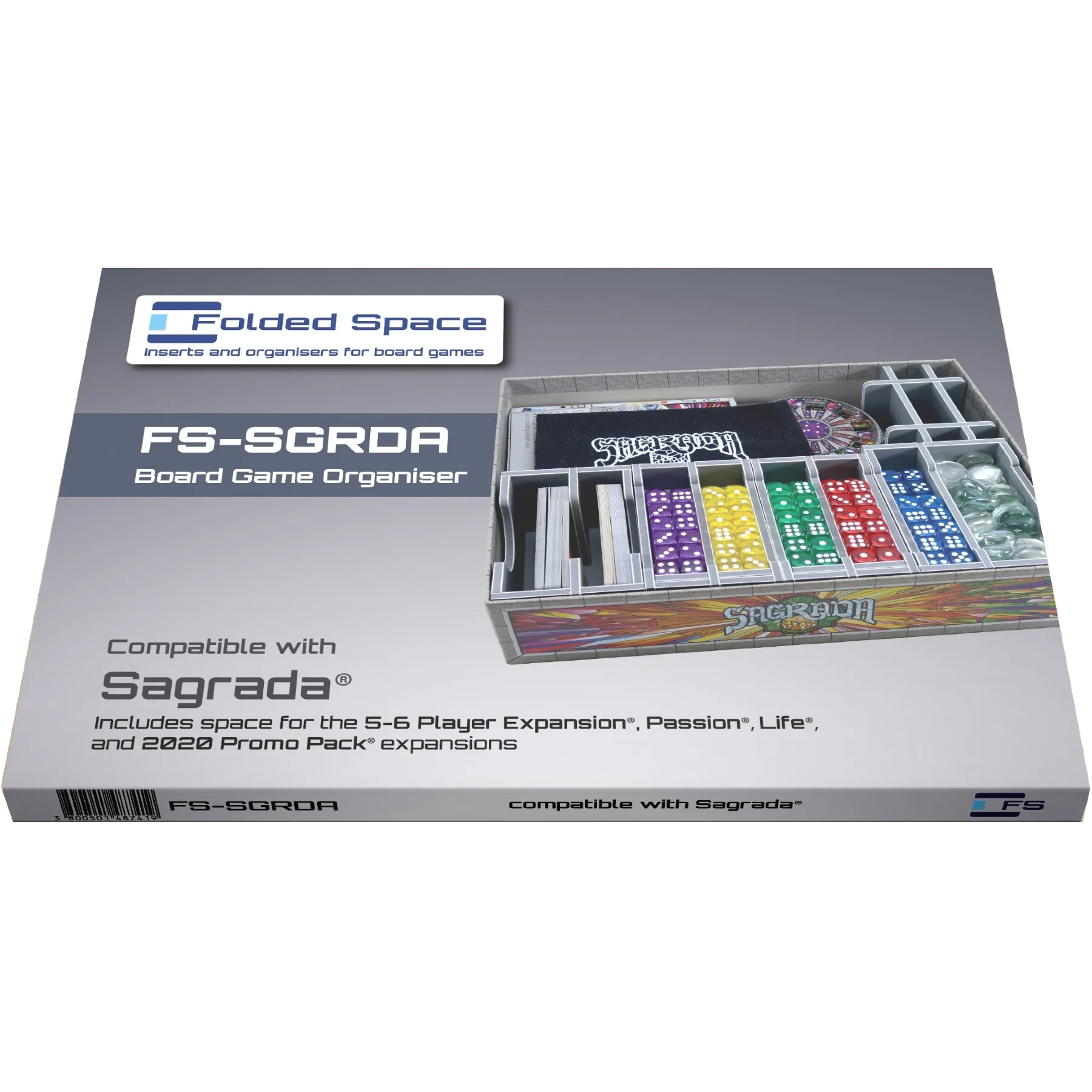 Insert compatible with Sagrada®, including 5-6 Player Expansion®, The Great Facades – Passion®, The Great Facades – Life®, and various promo expansions. The design provides both efficient storage and improved game play. Many of the trays can be utilised during the game, and they greatly aid set-up and clear-away times.