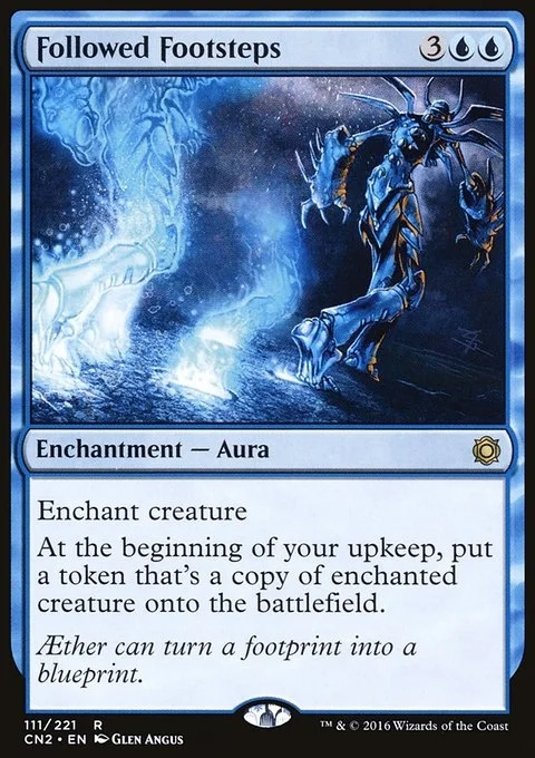 At the beginning of your upkeep, put a token that's a copy of enchanted creature onto the battlefield.