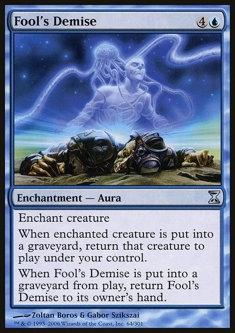 Enchant creature When enchanted creature dies, return that card to the battlefield under your control. When Fool's Demise is put into a graveyard from the battlefield, return Fool's Demise to its owner's hand.