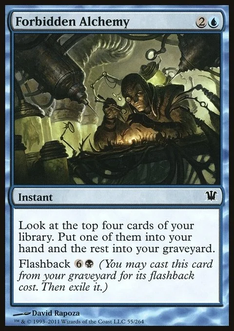 Look at the top four cards of your library. Put one of them into your hand and the rest into your graveyard. Flashback {6}{B} (You may cast this card from your graveyard for its flashback cost. Then exile it.)