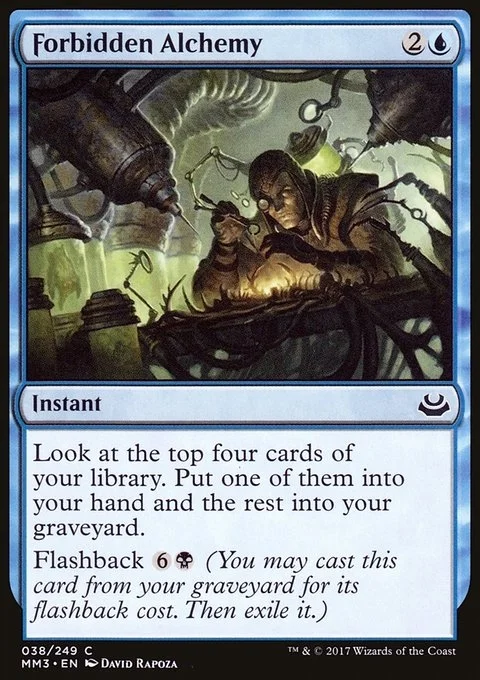 Look at the top four cards of your library. Put one of them into your hand and the rest into your graveyard. Flashback {6}{B} (You may cast this card from your graveyard for its flashback cost. Then exile it.)