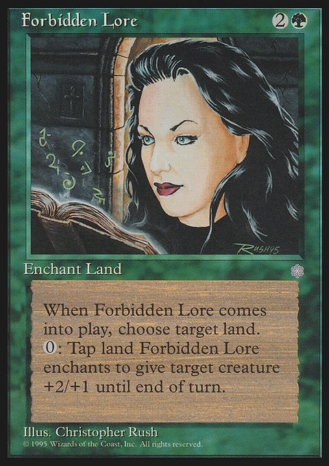 When Forbidden Lore comes into play, choose target land.0: Tap land Forbidden Lore enchants to give target creature +2/+1 until end of turn.