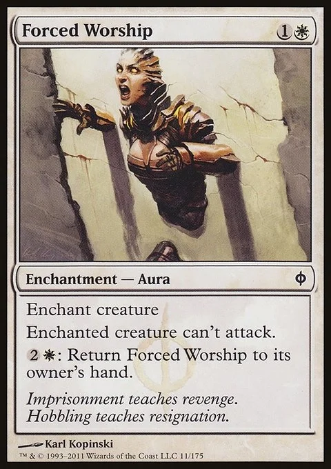 Enchant creature Enchanted creature can't attack. {2}{W}: Return Forced Worship to its owner's hand.