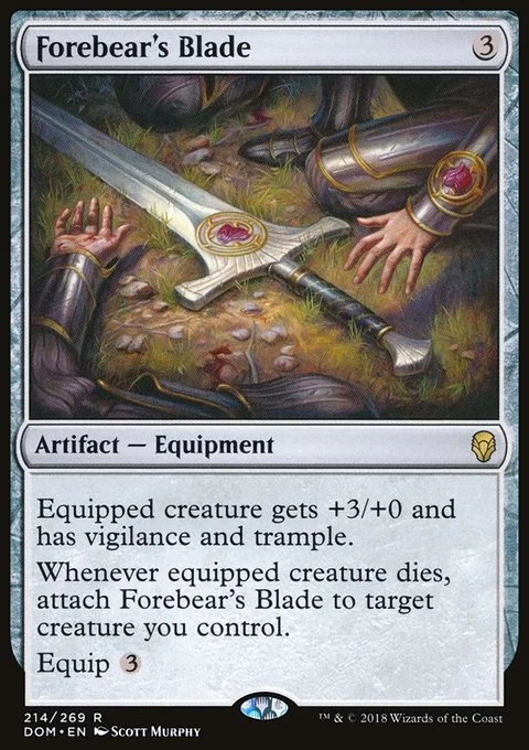 Equipped creature gets +3/+0 and has vigilance and trample. Whenever equipped creature dies, attach Forebear's Blade to target creature you control. Equip {3}