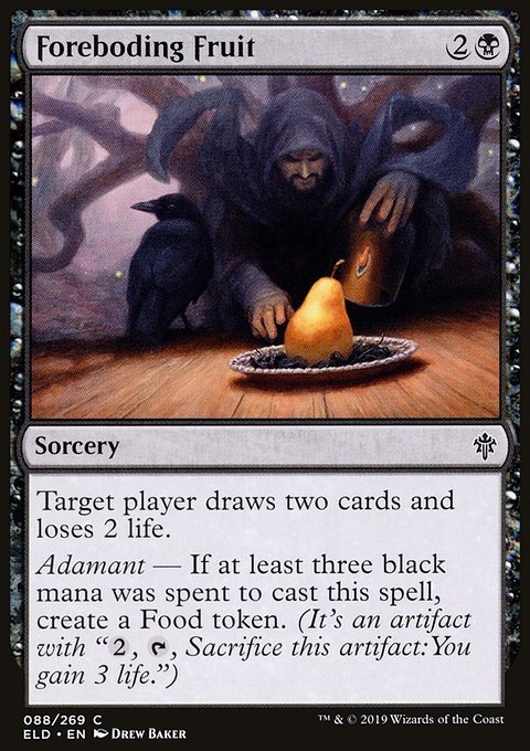 Target player draws two cards and loses 2 life. Adamant — If at least three black mana was spent to cast this spell, create a Food token. (It's an artifact with "{2}, {T}, Sacrifice this token: You gain 3 life.")