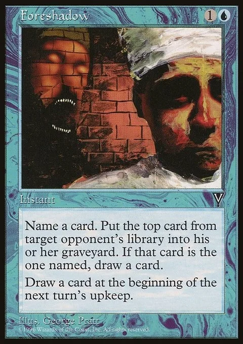 Name a card. Put the top card from target opponent’s library into his or her graveyard. If that card is the one named, draw a card.Draw a card at the beginning of the next turn’s upkeep.