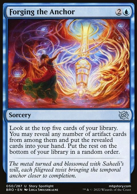 Look at the top five cards of your library. You may reveal any number of artifact cards from among them and put the revealed cards into your hand. Put the rest on the bottom of your library in a random order.