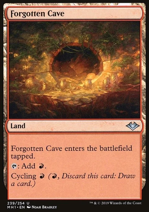 Forgotten Cave enters the battlefield tapped. {T}: Add {R}. Cycling {R} ({R}, Discard this card: Draw a card.)