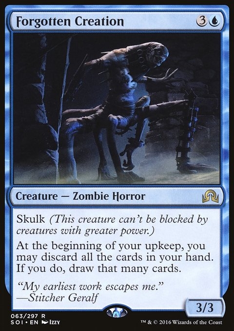 Skulk (This creature can't be blocked by creatures with greater power.) At the beginning of your upkeep, you may discard all the cards in your hand. If you do, draw that many cards.
