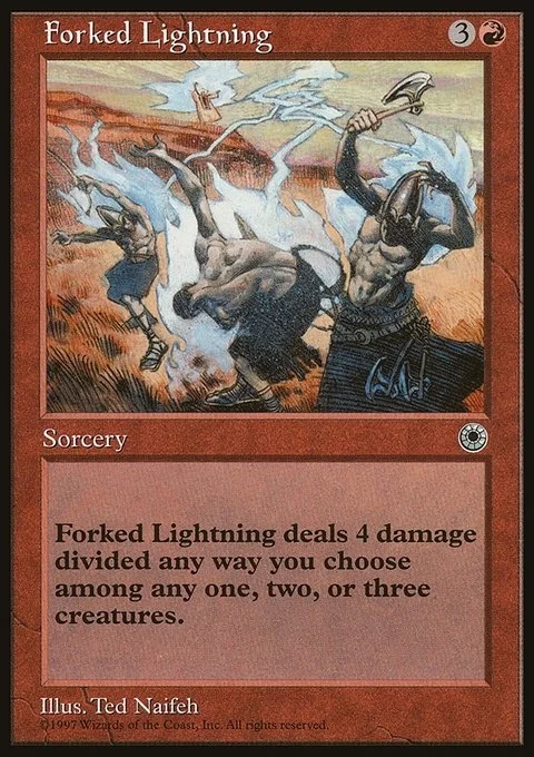 Forked Lightning deals 4 damage divided any way you choose among any one, two, or three creatures.