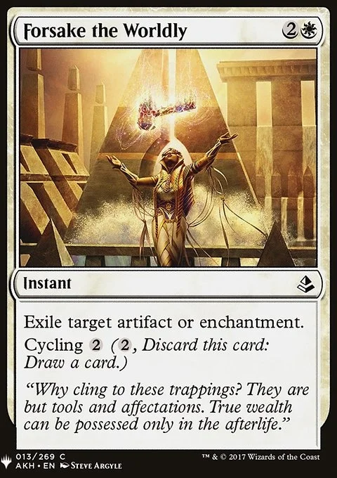 Exile target artifact or enchantment. Cycling {2} ({2}, Discard this card: Draw a card.)