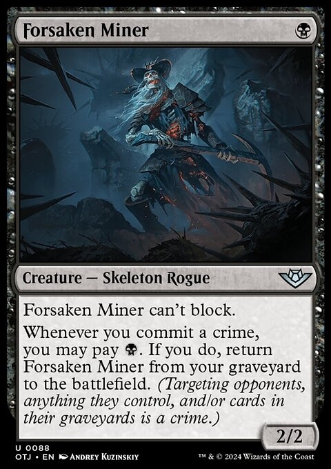 Forsaken Miner can't block. Whenever you commit a crime, you may pay {B}. If you do, return Forsaken Miner from your graveyard to the battlefield. (Targeting opponents, anything they control, and/or cards in their graveyards is a crime.)