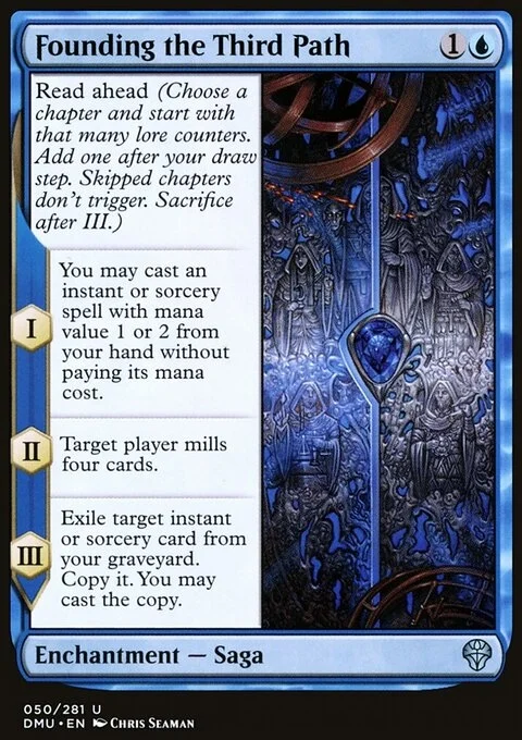 Read ahead (Choose a chapter and start with that many lore counters. Add one after your draw step. Skipped chapters don't trigger. Sacrifice after III.) I — You may cast an instant or sorcery spell with mana value 1 or 2 from your hand without paying its mana cost. II — Target player mills four cards. III — Exile target instant or sorcery card from your graveyard. Copy it. You may cast the copy.