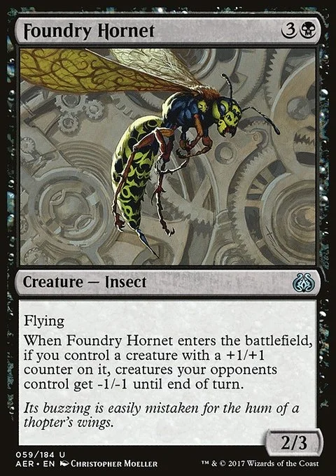 Flying When Foundry Hornet enters the battlefield, if you control a creature with a +1/+1 counter on it, creatures your opponents control get -1/-1 until end of turn.