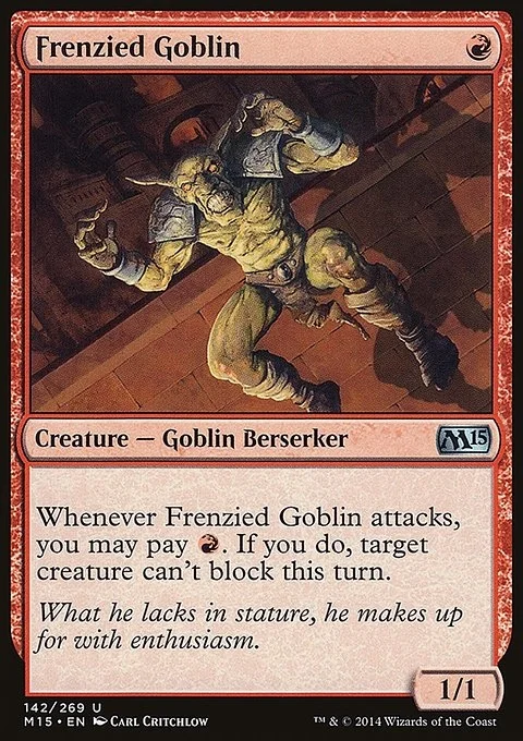 Whenever Frenzied Goblin attacks, you may pay R. If you do, target creature can’t block this turn.
