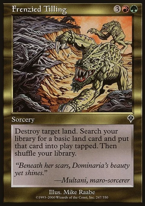 Destroy target land. Search your library for a basic land card, put that card onto the battlefield tapped, then shuffle.