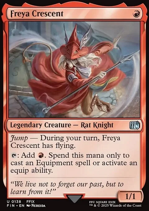 Jump — During your turn, Freya Crescent has flying. {T}: Add {R}. Spend this mana only to cast an Equipment spell or activate an equip ability.
