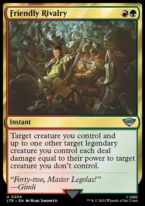 Target creature you control and up to one other target legendary creature you control each deal damage equal to their power to target creature you don't control.