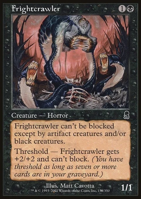 Fear (This creature can't be blocked except by artifact creatures and/or black creatures.) Threshold — As long as seven or more cards are in your graveyard, Frightcrawler gets +2/+2 and can't block.