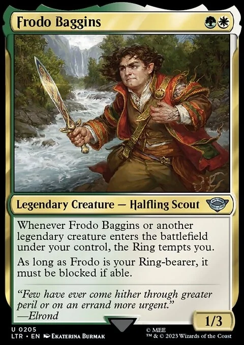 Whenever Frodo Baggins or another legendary creature enters the battlefield under your control, the Ring tempts you. As long as Frodo is your Ring-bearer, it must be blocked if able.