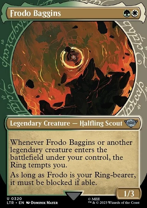 Whenever Frodo Baggins or another legendary creature enters the battlefield under your control, the Ring tempts you. As long as Frodo is your Ring-bearer, it must be blocked if able.