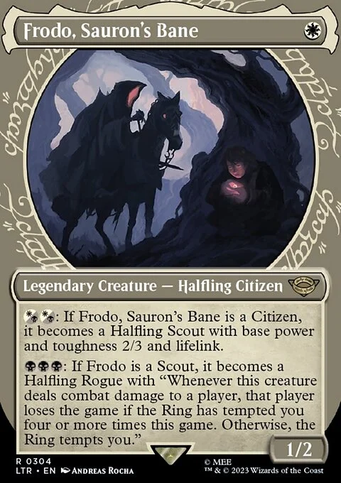 {B}{B}{B}: If Frodo is a Scout, it becomes a Halfling Rogue with "Whenever this creature deals combat damage to a player, that player loses the game if the Ring has tempted you four or more times this game. Otherwise, the Ring tempts you."