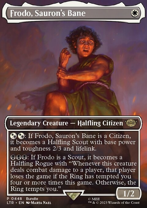 {B}{B}{B}: If Frodo is a Scout, it becomes a Halfling Rogue with "Whenever this creature deals combat damage to a player, that player loses the game if the Ring has tempted you four or more times this game. Otherwise, the Ring tempts you."