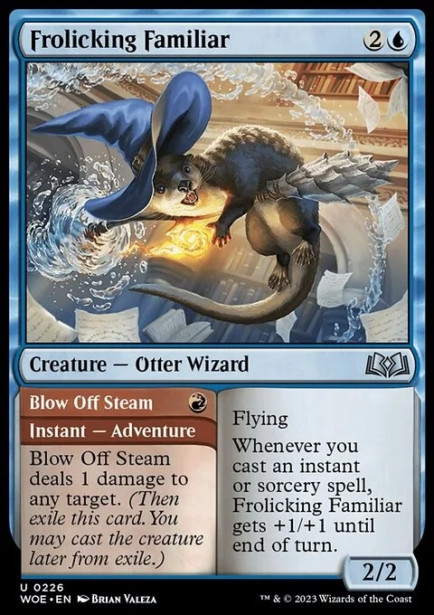 Frolicking Familiar Flying Whenever you cast an instant or sorcery spell, Frolicking Familiar gets +1/+1 until end of turn. Blow Off Steam Blow Off Steam deals 1 damage to any target. (Then exile this card. You may cast the creature later from exile.)