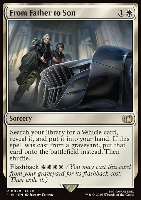 Search your library for a Vehicle card, reveal it, and put it into your hand. If this spell was cast from a graveyard, put that card onto the battlefield instead. Then shuffle.