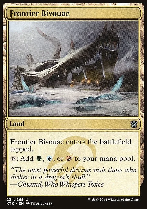 Frontier Bivouac enters the battlefield tapped. {T}: Add {G}, {U}, or {R}.
