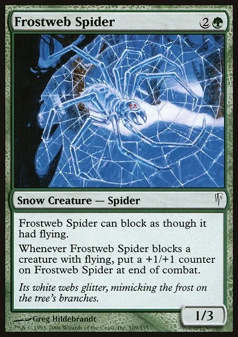 Reach (This creature can block creatures with flying.) Whenever Frostweb Spider blocks a creature with flying, put a +1/+1 counter on Frostweb Spider at end of combat.