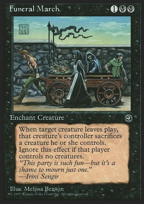 Enchant creature When enchanted creature leaves the battlefield, its controller sacrifices a creature.