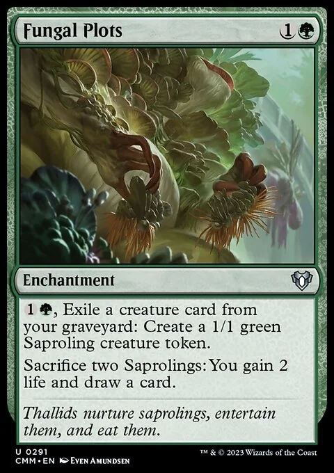 {1}{G}, Exile a creature card from your graveyard: Create a 1/1 green Saproling creature token. Sacrifice two Saprolings: You gain 2 life and draw a card.