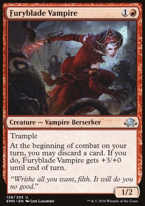 Trample At the beginning of combat on your turn, you may discard a card. If you do, Furyblade Vampire gets +3/+0 until end of turn.