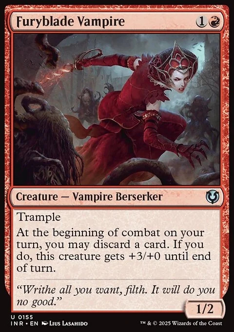 Trample At the beginning of combat on your turn, you may discard a card. If you do, Furyblade Vampire gets +3/+0 until end of turn.