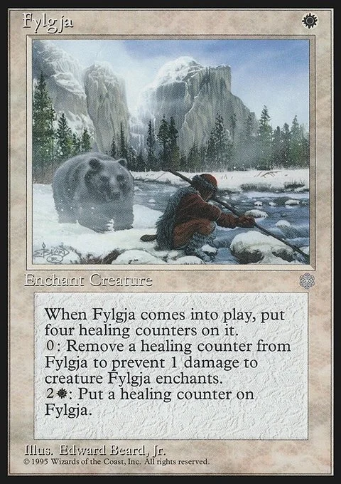 Enchant creature Fylgja enters the battlefield with four healing counters on it. Remove a healing counter from Fylgja: Prevent the next 1 damage that would be dealt to enchanted creature this turn. {2}{W}: Put a healing counter on Fylgja.