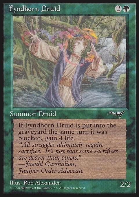 When Fyndhorn Druid dies, if it was blocked this turn, you gain 4 life.