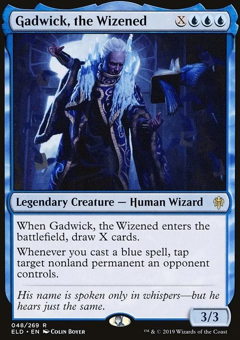 When Gadwick, the Wizened enters, draw X cards. Whenever you cast a blue spell, tap target nonland permanent an opponent controls.