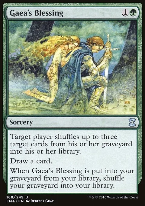 Target player shuffles up to three target cards from their graveyard into their library. Draw a card. When Gaea's Blessing is put into your graveyard from your library, shuffle your graveyard into your library.